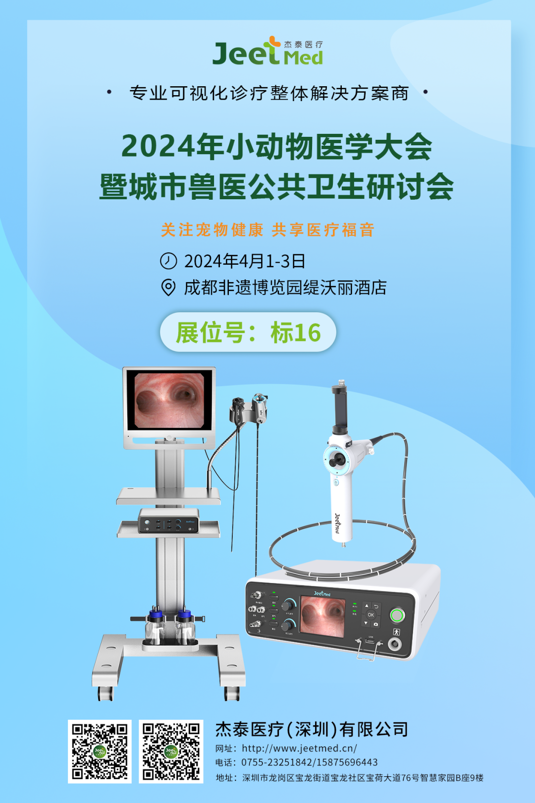 杰泰医疗诚挚邀请您参观2024年4月1-3日在成都非遗博览缇沃丽酒店举办的2024年小动物医学大会暨城市兽医公共卫生研讨会,展位:标16,本次大会,我司将携带JTA-310内窥镜工作站、RAE-109动物胃肠镜、动物耳鼻喉镜等产品亮相成都小动物医学会,欢迎各位专家、兽医师及广大新老顾客莅临展位交流指导!